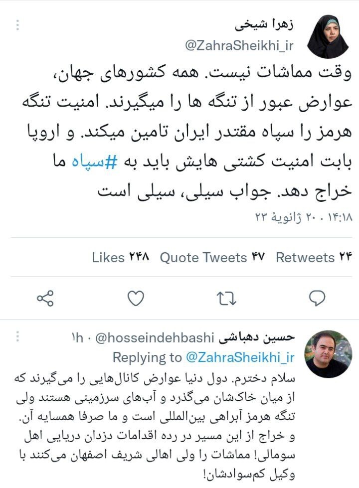 حسین دهباشی نیز به این توئیت زهرا شیخی واکنش تندی نشان داد وی نوشت: سلام دخترم. دول دنیا عوارض کانالهایی را می گیرند که از میان خاکشان می گذرد و آب های سرزمینی هستند ولی تنگه هرمز آبراهی بین المللی است و ما صرفا همسایه آن. و خراج از این مسیر در رده اقدامات دزدان دریایی اهل سومالی! مماشات را ولی اهالی شریف اصفهان می کنند با وکیل کم سوادشان!