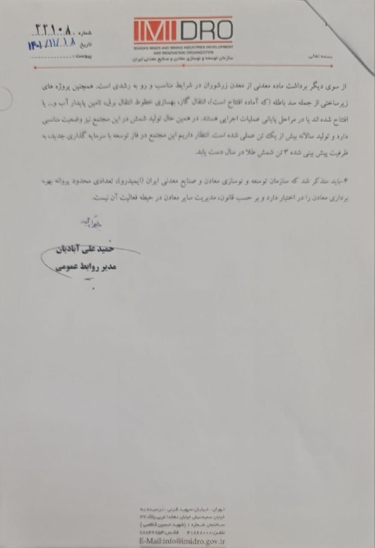 رویداد۲۴ روز دوشنبه ۱۷ بهمن رویداد۲۴ در گزارشی با عنوان «کارنامه دو ساله ایمیدرو در دولت رئیسی/ وجیهالله جعفری با معادن ایران چه کرد؟» به وضعیت معادن ایران پرداخت و به نقل از نمایندگان مجلس و فعالان این حوزه، از وضعیتی نوشت که در معادن ایران میگذرد. سازمان توسعه و نوسازی معادن ایران در جوابیهای به گزارش رویداد۲۴ پاسخ داده که آن را در ادامه میخوانید. ذکر این نکته مهم است که رویداد۲۴ در روزهای آینده بخشهای مهمتری از آنچه در ایمیدرو میگذرد؛ به خصوص از آنچه در پرونده معدن زرشوران گذشته را به صورت گزارشهای سلسلهوار منتشر خواهد کرد.