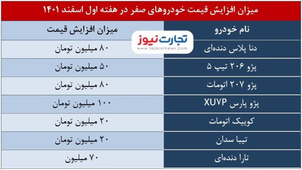 قیمت خودروهای صفر محبوب بازار بهطوری رشد پیدا کرد که دنا پلاس دندهای ۸۰ میلیون تومان، پژو ۲۰۶ تیپ ۵ حدود ۵۰ میلیون تومان، پژو ۲۰۷ اتومات ۸۰ میلیون تومان، پژو پارس XU۷P حدود ۱۰۰ میلیون تومان، کوییک اتومات۲۰ میلیون تومان، تیبا سدان۲۰ میلیون تومان و تارا دندهای ۷۰ میلیون تومان در یک هفته افزایش قیمت داشتند.