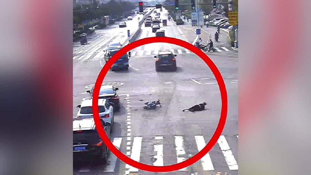 ویدیو ضبط شده توسط دوربین کنترل راهنمایی و رانندگی نشان میدهد که یک موتور سوار بدون توجه به چراغ قرمز عبور میکند که باعث برخورد با پراید میشود.