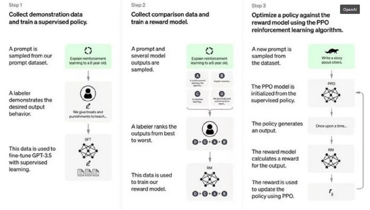 سپس در مرحله آموزش تقویتی، مربیان تعدادی از پاسخهای ایجاد شده توسط رباتهای گفتگو را جمعآوری کردند و بر اساس کیفیت آنها را رتبهبندی کردند. در نهایت، این مدل میتواند پیشبینی کند که کدام کلمات و پاسخها بیشتر برای انسان جذاب هستند.