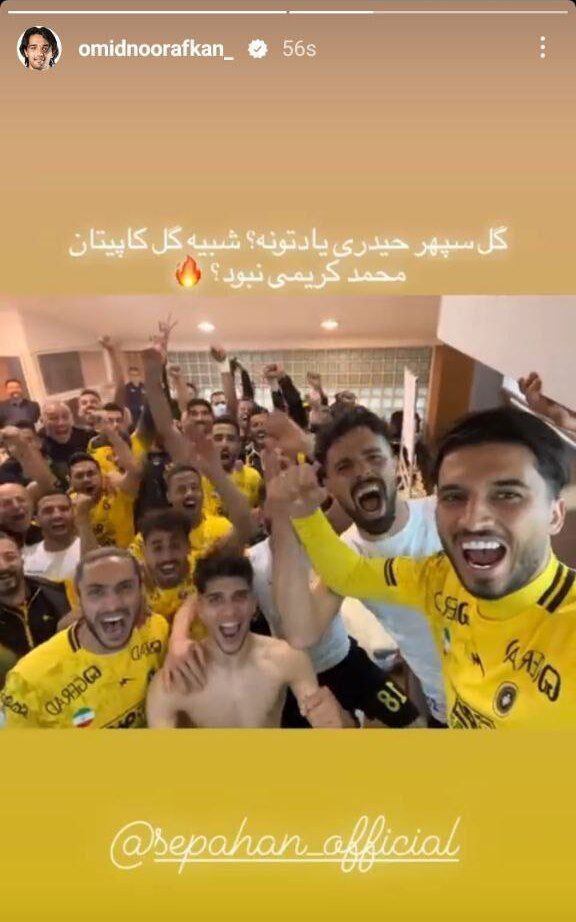 یکی از بازیکنانی که پس از پایان این دیدار برای هواداران پرسپولیس کری خواند امید نورافکن بود. این مدافع که سابقه بازی برای استقلال را نیز دارد تنها به مصاحبه در میکسدزون خبری بسنده نکرد و بلافاصله یک استوری جنجالی را نیز در صفحه شخصی اینستاگرام خود منتشر کرد.