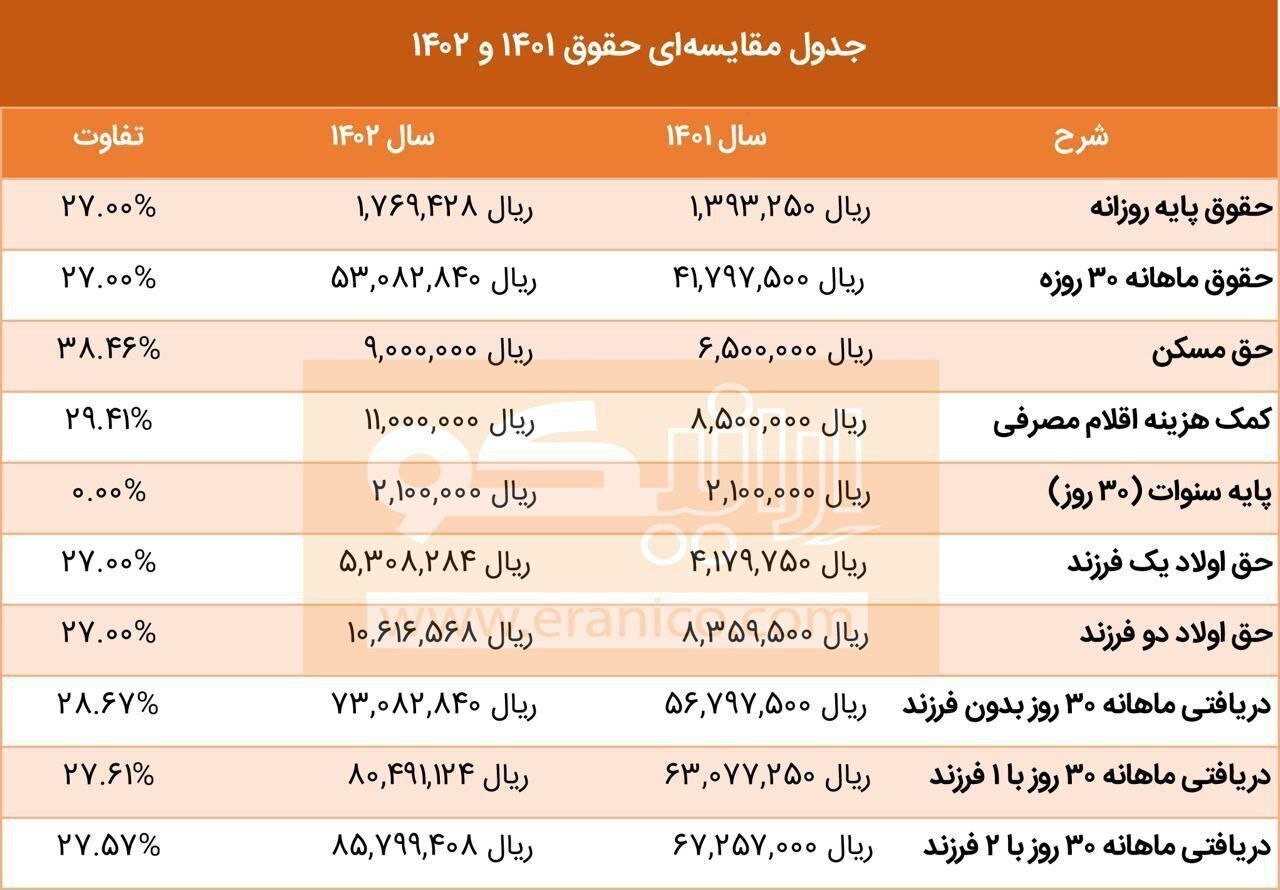 مقایسه حقوق ۱۴۰۱ و ۱۴۰۲ در یک نگاه + جدول