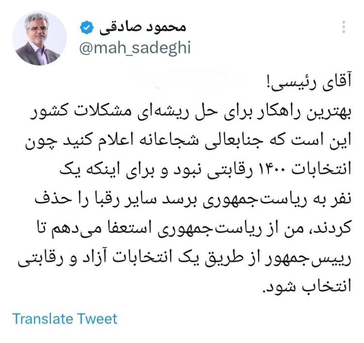 محمود صادقی خواستار استعفای ابراهیم رئیسی و برگزاری انتخابات آزاد و رقابتی برای حل ریشهای مشکلات کشور شد.