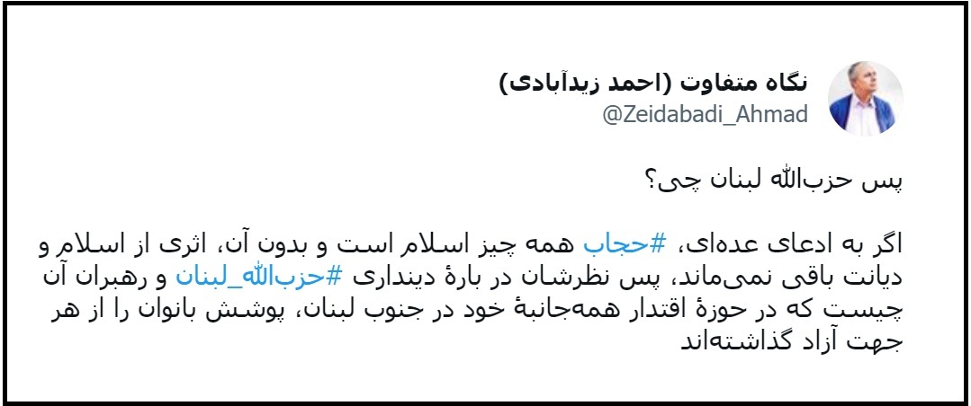 رویداد۲۴ احمد زیدآبادی فعال سیاسی اصلاح‌طلب در توییتی در واکنش به سختگیری‌های زیاد به حجاب در ایران، آن را با حزب الله لبنان مقایسه کرد و نوشت: «وقتی بی‌حجاب‌ها طرفدار حزب‌الله می‌شوند؛ این یعنی جذب حداکثری.» در توییت زیدآبادی آمده است: «اگر به ادعای عده‌ای، حجاب همه‌چیز اسلام است و بدون آن، اثری از اسلام و دیانت باقی نمی‌ماند، پس نظرشان دربارۀ دینداری حزب‌الله لبنان و رهبران آن چیست که در حوزۀ اقتدار همه‌جانبۀ خود در جنوب لبنان، پوشش بانوان را از هرجهت آزاد گذاشته‌اند به‌طوری‌که در گردهم‌آیی‌های رسمی آنان، زنان بسیاری با پوششی در سطح زنان جوامع غربی حضور می‌یابند؟