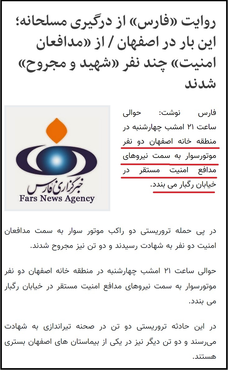 خبرگزاری فارس صبح روز ۲۶ آبان اطلاعیهای را تحت عنوان «اطلاعیه حمله تروریستی به حوزه بسیج در اصفهان» منتشر کرد و در آن به نقل از روحالله حکیمیفرد مسئول روابط عمومی سپاه صاحبالزمان استان اصفهان، اطلاعیه منتشر شده حوزه بسیج را کذب خواند. البته او تایید کرده که «شامگاه چهارشنبه مورخ ۲۵ آبان ماه، عوامل تروریستی به سمت نیروهای مدافع امنیت تیراندازی کردهاند و ۲ نفر از نیروهای بسیجی به شهادت رسیده و ۲ نفر دیگر نیز مجروح شدند.»