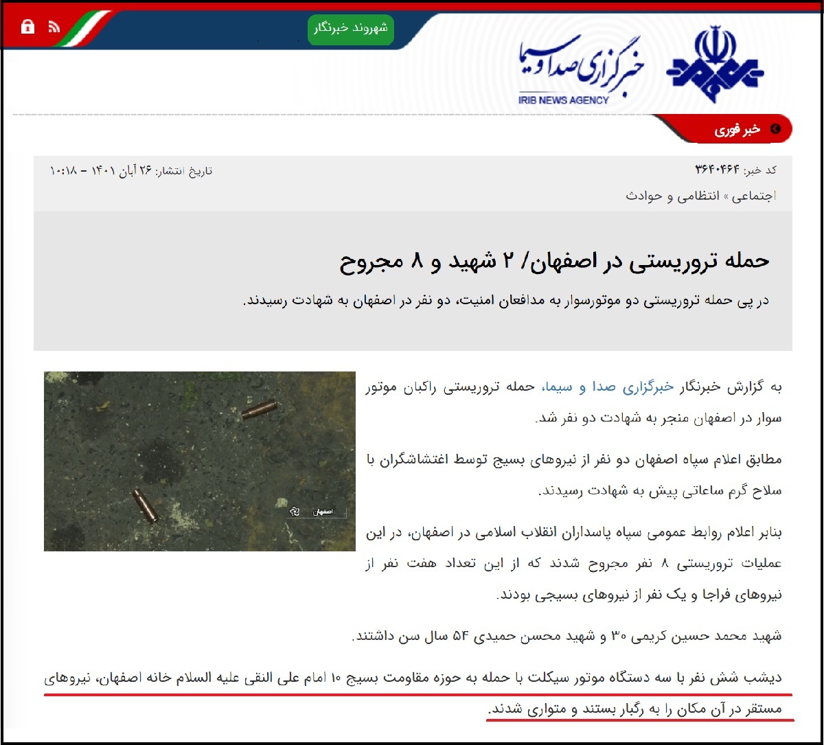 خبر دوم توسط خبرگزاری صدا و سیما و به نقل روابط عمومی سپاه پاسداران در اصفهان منتشر شد. این بار «دو موتورسوار» به «شش نفر با سه موتورسیکلت» تغییر کرد و عمق عملیات را هم گسترش داد. در گزارش فارس گفته شده بود که «نیروهای مدافع امنیت مستقر در خیابان» به رگبار بسته شدند، اما در خبر صداوسیما اعلام شده بود که «یک پایگاه بسیج به رگبار بسته شد»