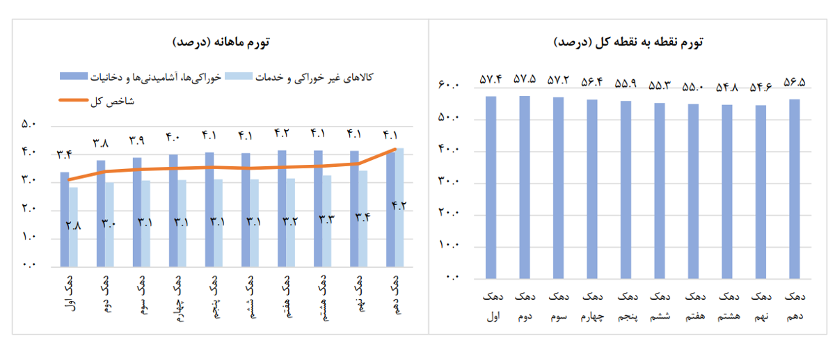 نمودار تورم ماهانه و نقطه به نقطه برای دهک‌های مختلف هزینه‌ای به صورت زیر است: