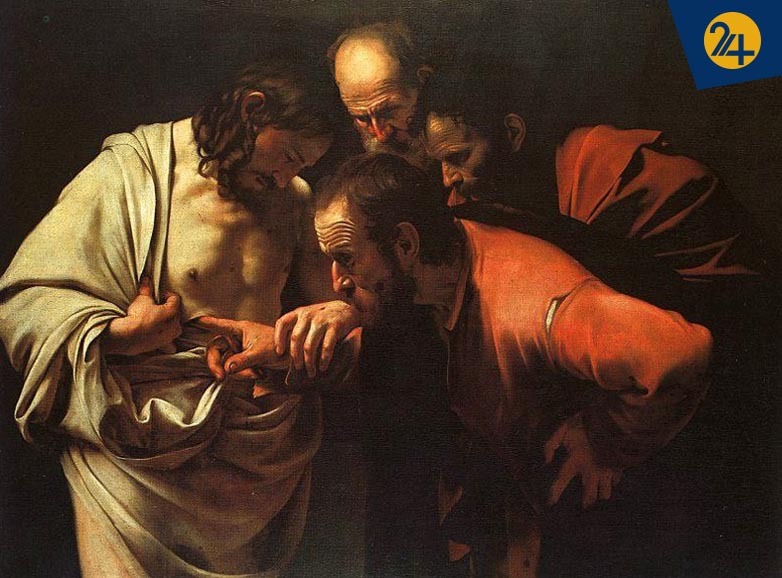 تابلوی تومای شکاک که توسط «کاراواجو» کشیده شده، اشاره به داستان شک توما از مرگ عیسی مسیح دارد. در انجیل یوحنا باب ۲۰ آیات ۲۹-۲۴ درباره این ماجرا چنین آمده است: «هنگامی که عیسی آمد، توما، یکی از آن دوازده تن، که دوقلو نیز خوانده میشد، با ایشان نبود. پس دیگر شاگردان به او گفتند: «خداوند را دیدهایم!» اما او به ایشان گفت: «تا خود نشانِ میخها را در دستهایش نبینم و انگشت خود را بر جای میخها نگذارم و دست خویش را در سوراخ پهلویش ننهم، ایمان نخواهم آورد.» پس از هشت روز، یعنی یکشنبۀ هفتۀ بعد. شاگردان عیسی باز در خانه بودند و توما با آنها بود. در آن حال که درها قفل بود، عیسی آمد و در میان ایشان ایستاد و گفت: «سلام بر شما» آنگاه به توما گفت: «انگشت خود را اینجا بگذار و دستهایم را ببین، و دست خود را پیش آور و در سوراخ پهلویم بگذار و بیایمان مباش، بلکه ایمان داشته باش. " توما به او گفت: "خداوند من و خدای من! " عیسی گفت: "آیا، چون مرا دیدی ایمان آوردی؟ خوشا به حال آنان که نادیده، ایمان آورند.»