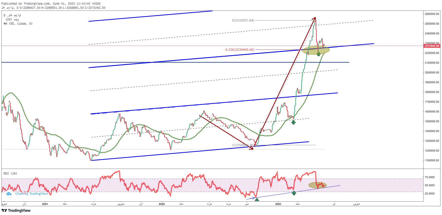 مفروضاتی مثل وضعیت اندیکاتور RSI در شاخص کل بورس تهران که در میانههای راه قرار دارد و نشان از تعادل در بازار است و یا خط روند صعودی کانال فرضی به همراه سطح 23 درصدی فیبوناچی موج قبلی همگی بدون تغییر خاص در بازار همچنان پابرجا هستند.