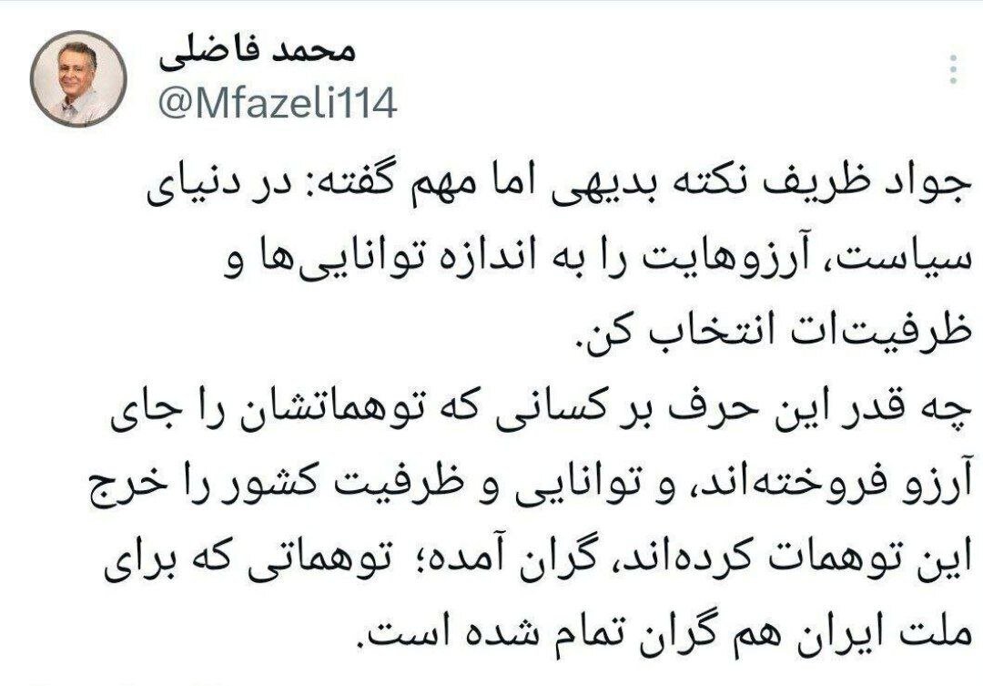 فاضلی نوشت: چقدر این حرف بر کسانی که توهماتشان را جای آرزو فروخته اند و توانایی و ظرفیت کشور را خرج این توهمات کرده اند گران آمده.