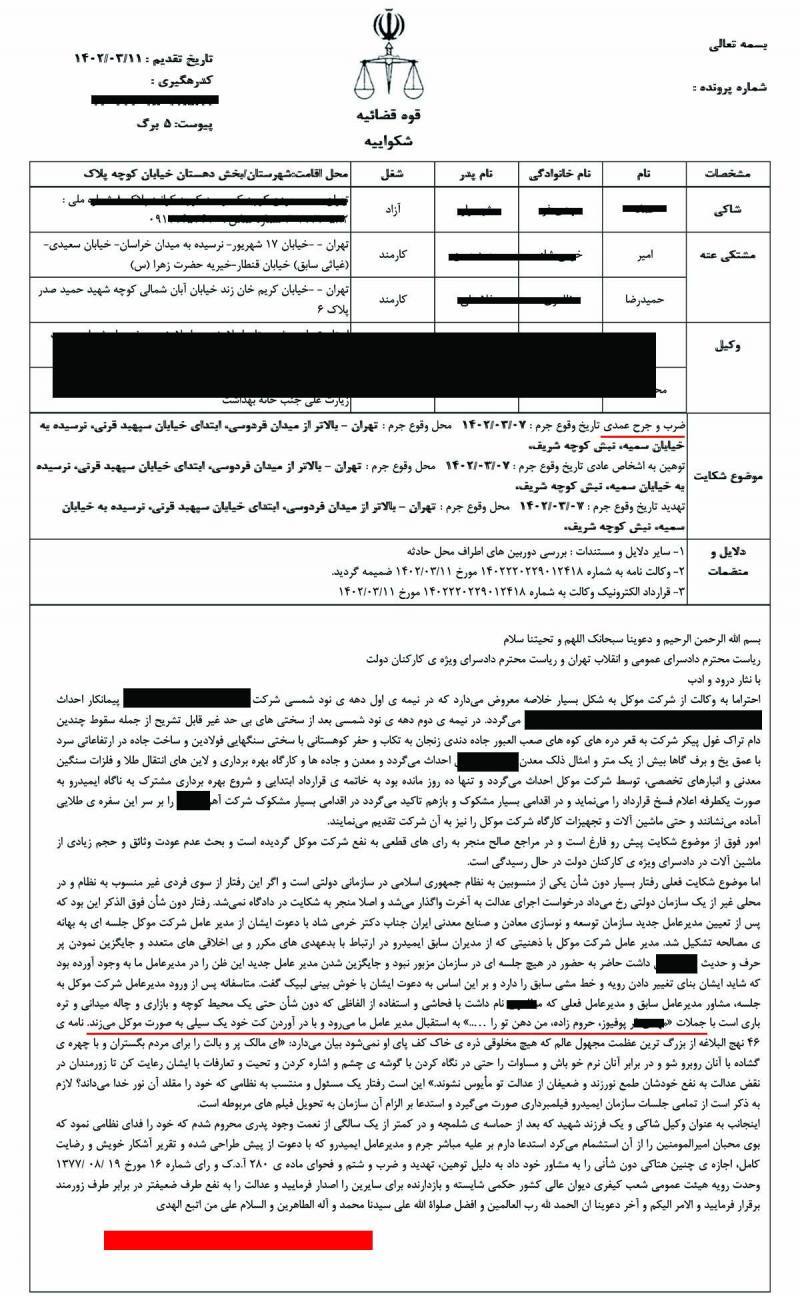 ۳) شرکت ایمیدرو گفته کتک زدن طلبکار صحت نداشته و اگر چنین چیزی بود، به جای انتشار در رسانه در دادگاه شکایت صورت میگرفت. این جمله در حالی گفته شده که اتفاقا شکایت از مدیرعامل ایمیدرو و مشاور ایشان که اقدام به کتک زدن طلبکار کرده، در دادسرای کارکنان دولت ثبت شده است و فعلا ابلاغ شده که هر دو مدیر باید در محضر دادگاه حاضر شوند. متن شکایت دادگاه نیز در ادامه منتشر میشود. در این متن مشخص است که تاریخ شکایت دو روز قبل از جوابیه ایمیدرو بوده و با اینکه آنها اطلاع داشتهاند باید در دادگاه حاضر شوند، باز هم خلاف واقع سخن گفتهاند و مدعی شدهاند که «اگر مدعی راست میگفت، چرا شکایت نکرد؟»