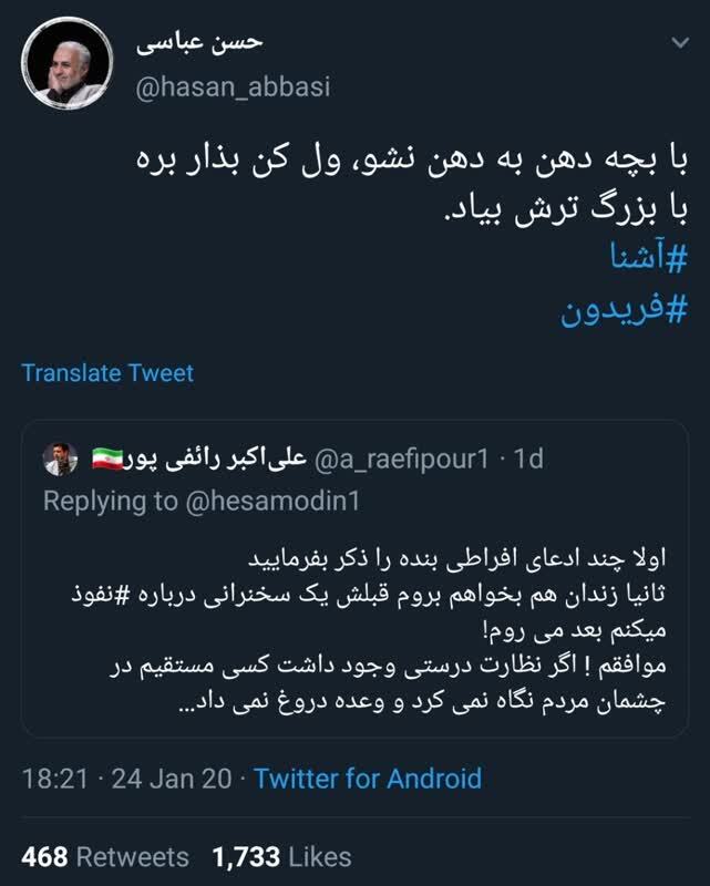 توییتهای حسن عباسی در توییتر نیز معمولا توجه بسیاری را جلب میکند. در ادامه چند توییت از حسن عباسی را میخوانیم: