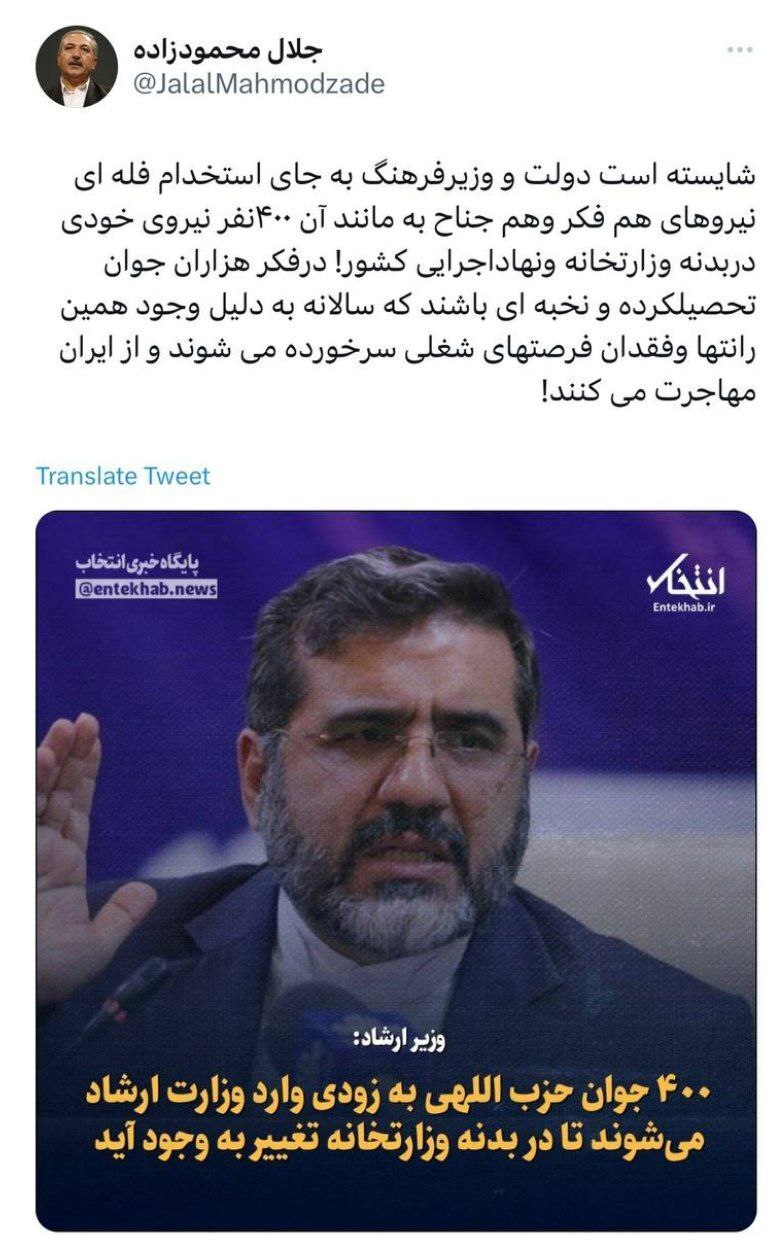 نماینده مهاباد به اظهارات وزیر فرهنگ و ارشاد اسلامی پیرامون استخدام ۴۰۰ نفر نیروی حزباللهی در آن وزارتخانه واکنش تندی نشان داد.