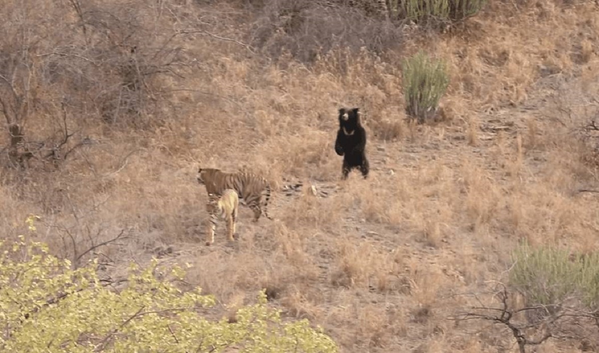 در حالی که ببر بدلیل غفلت خرس دست برتر را داشت، به محض اینکه خرس چشمش را به گربه دوخت، مشخص شد که حیوان غالب کیست. خرس تنبل ببر کنجکاو را به طرف شریک زندگی خود که روی علفها دراز کشیده بود، بدرقه کرد. خرس به طور مداوم روی پاهای عقبی خود بلند شد تا اندازه خود را نشان دهد و همین برای دو ببر کافی بود که دم خود را جمع کرده و فرار کردند و با عقبنشینی، خرس تنبل پیروز شدند.