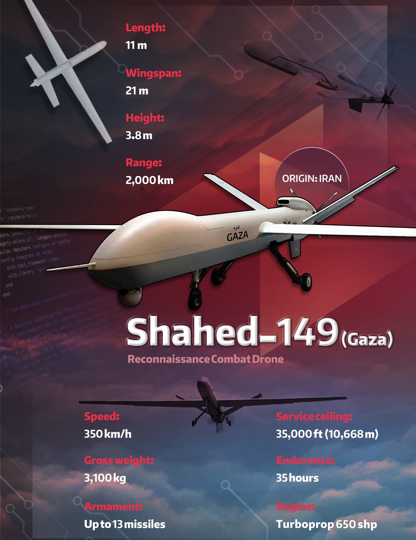 پهپاد شاهد-149 یک پهپاد جنگی شناسایی با قابلیت حمل 13 بمب، 500 کیلوگرم تجهیزات و همچنین پرواز 35 ساعته تا شعاع 2000 کیلومتر و توانایی انجام یک تنوع عملیات رزمی و اطلاعاتی و ارتقاء توان نظامی ایران است.