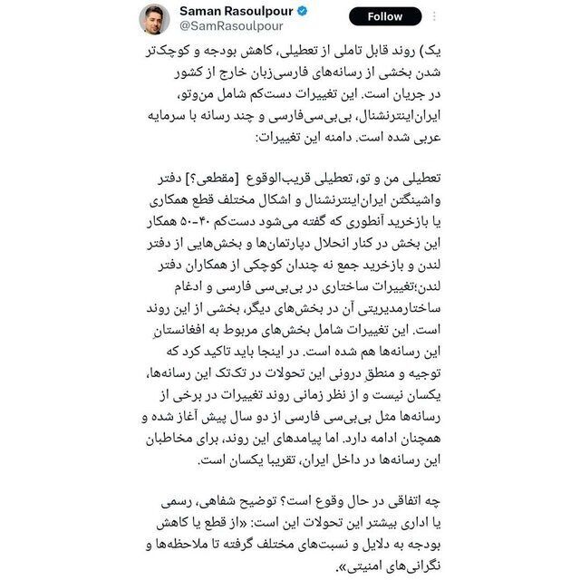 رویداد۲۴ ایسنا نوشت: سامان رسول پور سردبیر شبکه معاند ایران اینترنشنال در صفحه شخصی اش نوشته است: روند قابل تاملی از تعطیلی، کاهش بودجه، و کوچکتر شدن بخشی از رسانههای فارسی زبان خارج از کشور در جریان است.