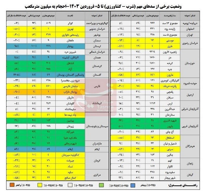 وضعیت سدهای مهم کشور در تأمین آب شرب و کشاورزی در جدول زیر آورده شده است.