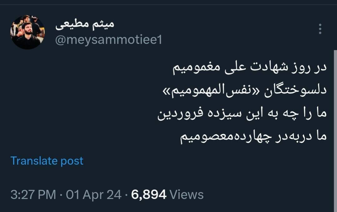 میثم مطیعی مداح منتقد، درواکنش توییتری به ۱۳ بدر که به شهادت حضرت علی مصادف شده بود، نوشت: «ما را چه به این سیزده فروردین، ما دربهدر چهاردهمعصومیم»