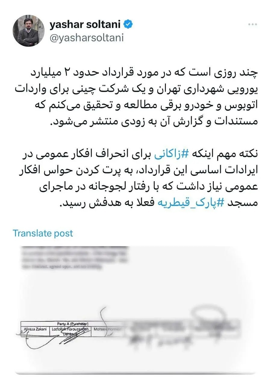 چند روزی است که در مورد قرارداد حدود ۲ میلیارد یورویی شهرداری تهران و یک شرکت چینی برای واردات اتوبوس و خودرو برقی مطالعه و تحقیق میکنم که مستندات و گزارش آن به زودی منتشر میشود.