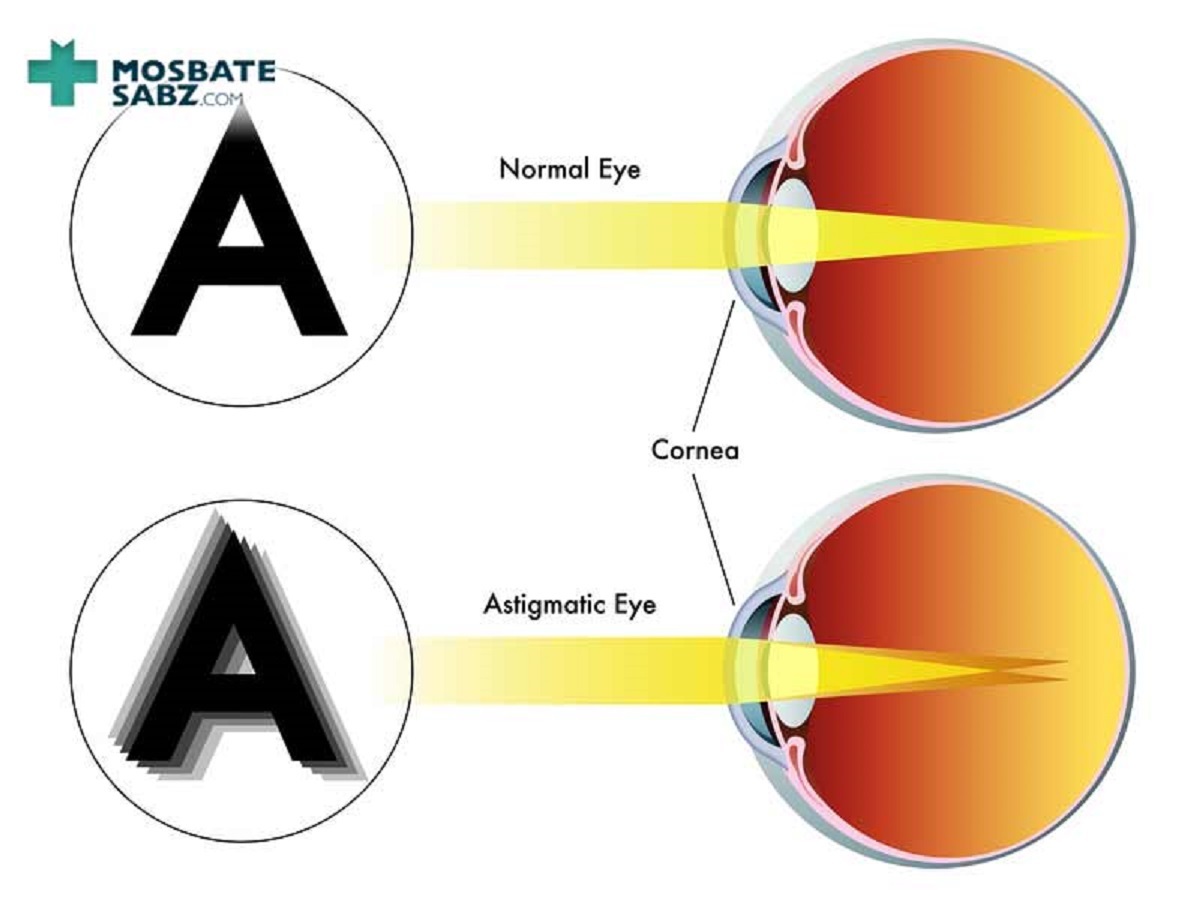آستیگماتیسم ناشی از آن است که قرنیه به جای شکل کروی مانند توپ بسکتبال، شکل بیضی مانند توپ فوتبال آمریکایی دارد و سطح جلویی چشم (قرنیه) یا عدسی داخل چشم دارای انحنای نامناسب است.