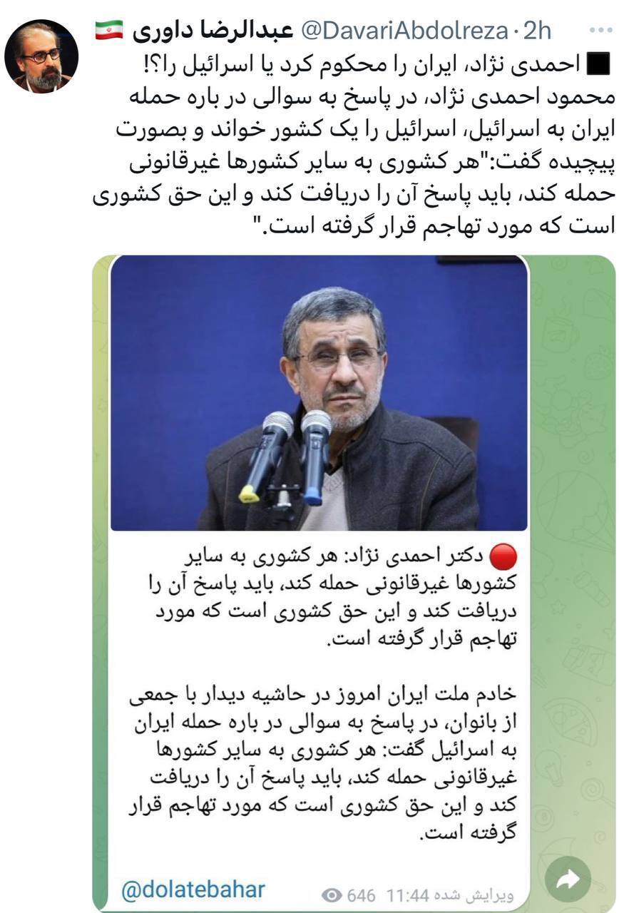 عبدالرضا داوری به صحبت های اخیر محمود احمدی نژاد نسبت به حمله ایران به اسرائیل واکنش نشان داد.