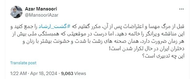 او در توییتر خود نوشت: قبل از مرگ مهسا و اعتراضات پس از آن، مکرر گفتیم که گشت ارشاد را جمع کنید و این مناقشه ویرانگر را خاتمه دهید. اما درست در موقعیتی که همبستگی ملی بیش از هر زمان ضرورت دارد، همان صحنههای زشت با شدت و خشونت بیشتر با زنان و دختران ایران در حال تکرار شدن است! این چه تدبیری است؟