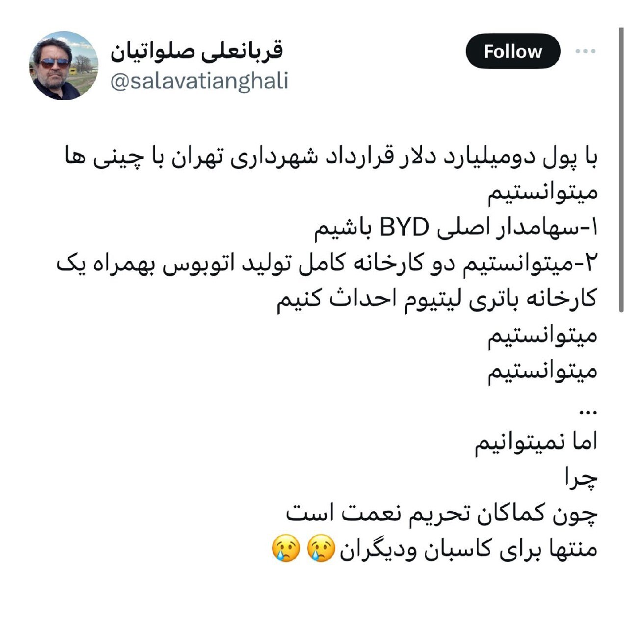 یکی از رزمندگان جنگ تحمیلی نسبت به قرارداد ۲ میلیارد یورویی شهردار تهران با چینیها واکنش کنایهآمیز نشان داد.