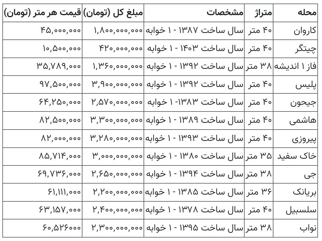 برای اطلاع از قیمت آپارتمانهای دیگر جدولی را که در ادامه آماده کردهایم بخوانید.