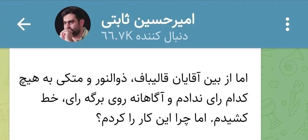 امیرحسین ثابتی در یک پیامی در کانال تلگرامیاش از رای باطله خود در انتخابات دیروز هیات رئیسه مجلس خبر داد.