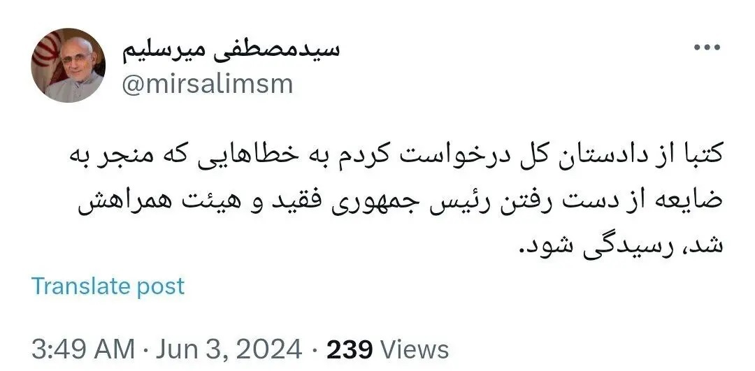 «مصطفی میرسلیم» از درخواست کتبی خود از دادستان کل درباره سقوط بالگرد حامل رئیسجمهوری خبر داد.