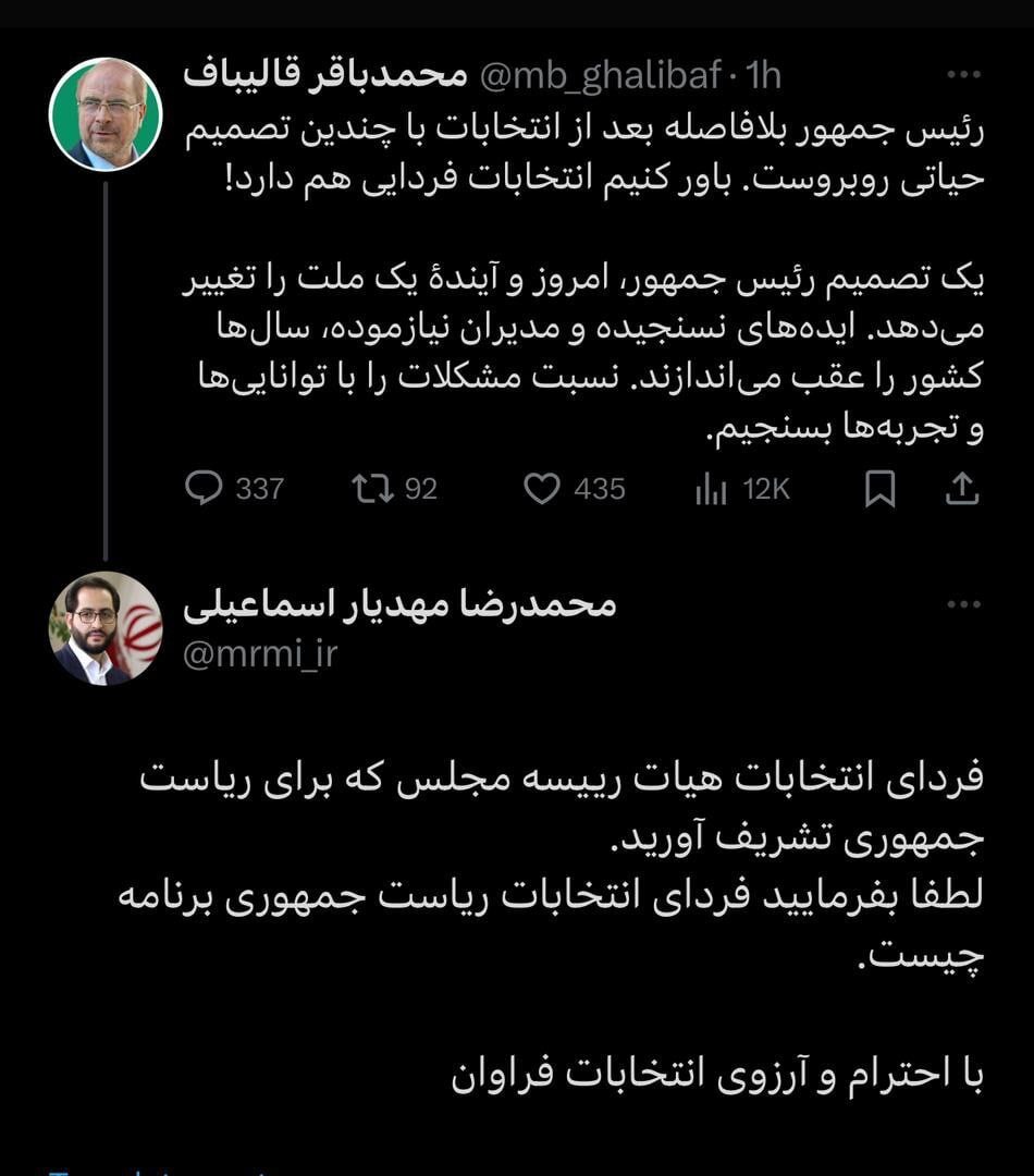 قالیباف توییت کرده بود: انتخابات فردایی دارد.