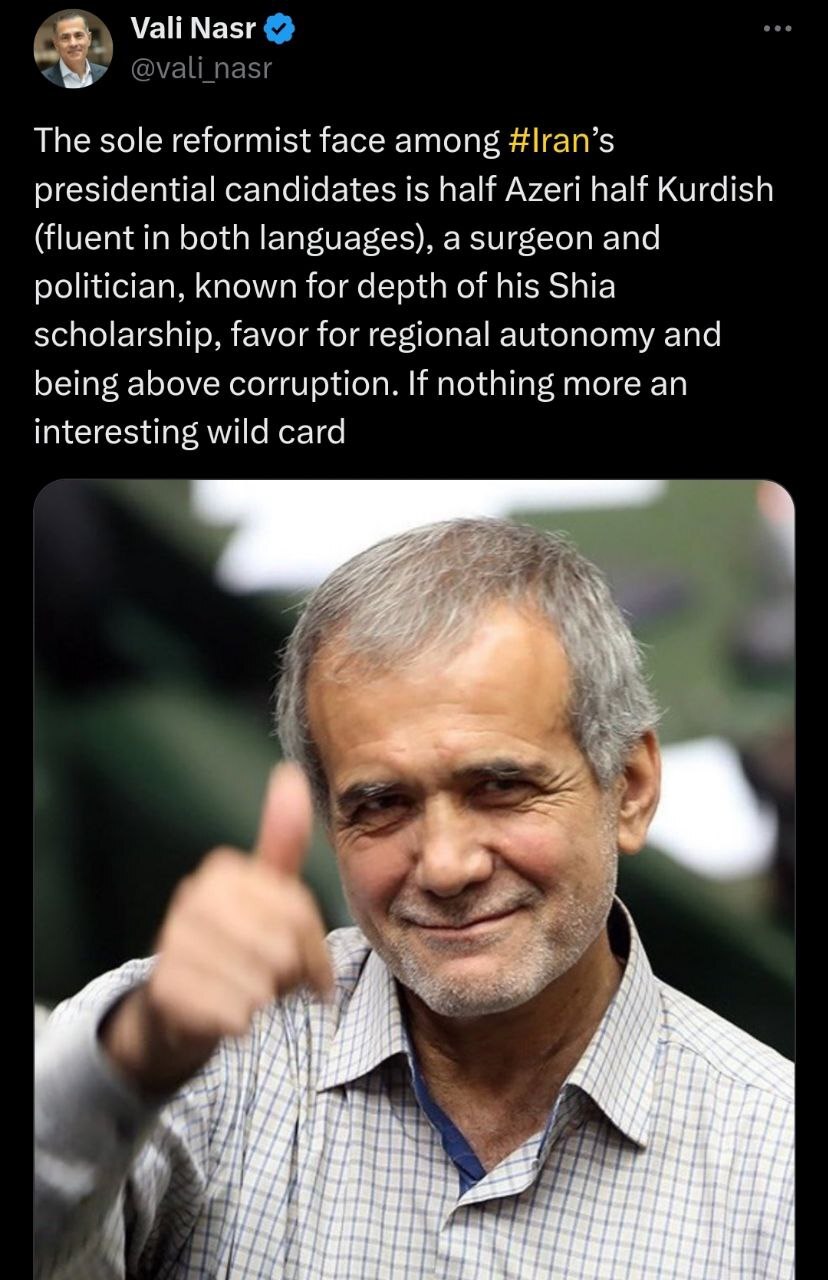 رویداد ۲۴ | پروفسور، ولی نصر، استاد دانشگاه جانز هاپکینز، متخصص مطالعات خاورمیانه و مشاور ارشد سابق وزارت امور خارجه آمریکا درباره پزشکیان نوشت: