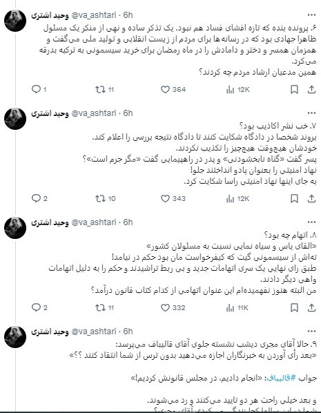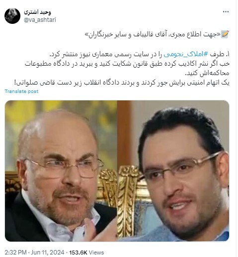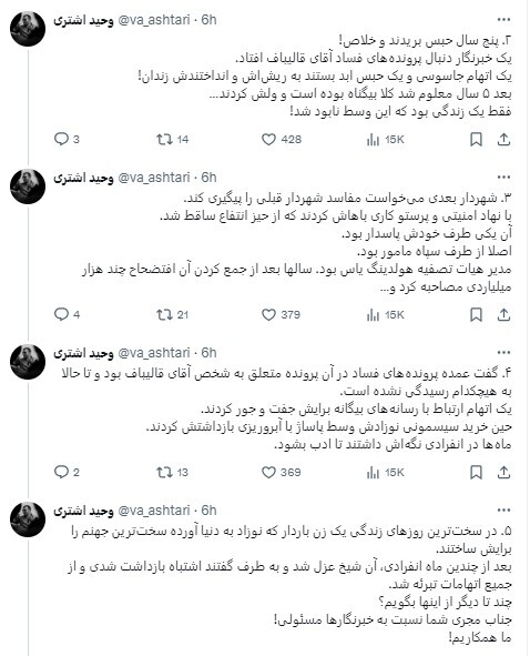 رویداد ۲۴ | وحید اشتری، فعال رسانهای منتقد قالیباف در یک رشته توییت با عنوان «جهت اطلاع مجری، آقای قالیباف و سایر خبرنگاران» نوشت: