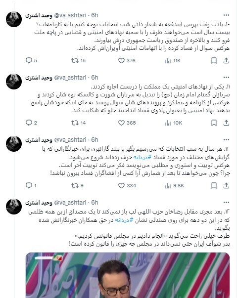 ۱۲. هر سال به شب انتخابات که میرسیم بگیر و ببند گازانبری برای خبرنگارانی که با گرایشهای مختلف در مورد فساد #دردانه حرف زدهاند شروع میشود.