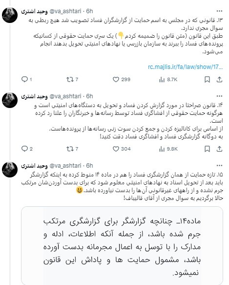 ۱۳. قانونی که در مجلس به اسم حمایت از گزارشگران فساد تصویب شد هیچ ربطی به سوال مجری ندارد.