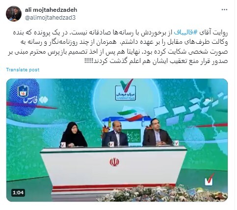 رویداد ۲۴ | علی مجتهدزاده، وکیل دادگستری در واکنش به اظهارات امروز قالیباف درباره برخوردش با رسانهها و خبرنگاران منتقد، نوشت: روایت آقای قالیباف از برخوردش با رسانهها صادقانه نیست. در یک پرونده که بنده وکالت طرفهای مقابل را بر عهده داشتم، همزمان از چند روزنامهنگار و رسانه به صورت شخصی شکایت کرده بود. نهایتا هم پس از اخذ تصمیم بازپرس محترم مبنی بر صدور قرار منع تعقیب ایشان هم اعلم گذشت کردند!