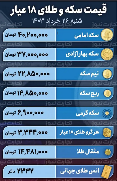 سکه امامی امروز شنبه ۲۶ خرداد با رشد ۵۰ هزار تومانی روی رقم ۴۰ میلیون و ۲۰۰ هزار تومانی در حال معامله است. سکه بهار افزایش ۲۱۰ هزار تومانی دارد و روی رقم ۳۷ میلیون تومانی ایستاده است.