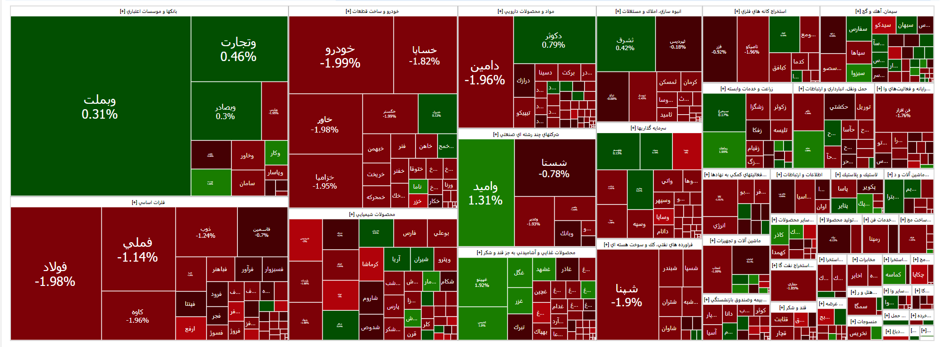 نمادهای فولاد، فملی، فارس، شپنا، شستا، وغدیر و نوری بیشترین اثر منفی را بر شاخص بورس گذاشتند.