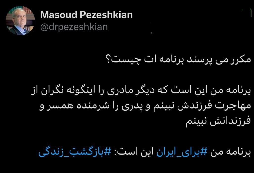 پزشکیان نوشت: ‏برنامه من ⁧ #برای_ایران ⁩ این است: #بازگشتِ_زندگی ⁩