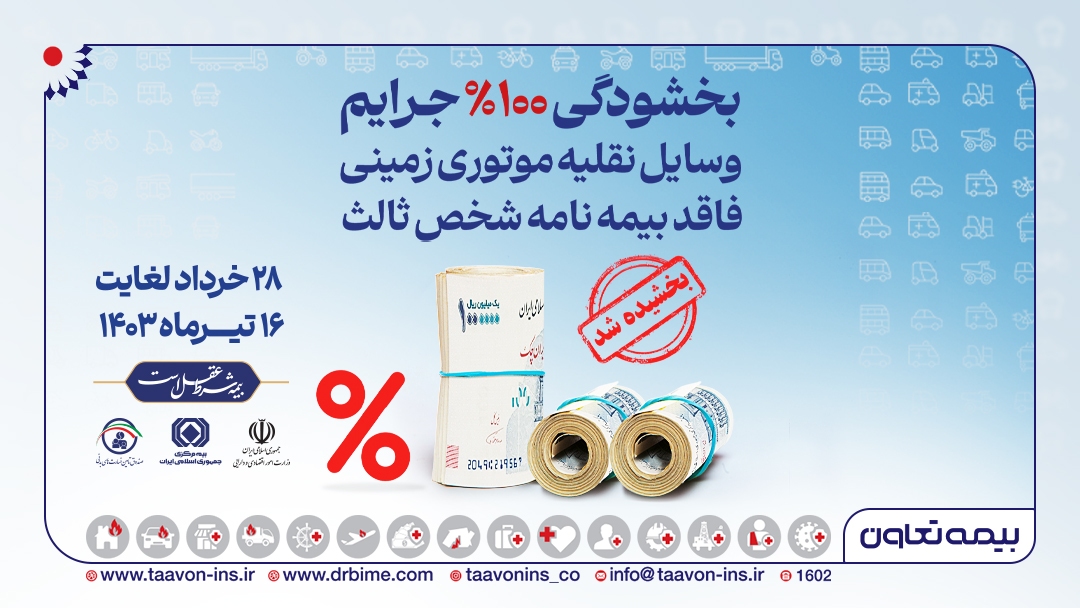 طرح بخشودگی ۱۰۰ درصد جرایم وسایل نقلیه فاقد بیمه شخص ثالث به مناسبت دهه امامت و ولایت به مدت ۲۰ روز، از تاریخ دوشنبه ۲۸ خرداد لغایت ۱۶ تیر ماه ۱۴۰۳ اجرا میشود.