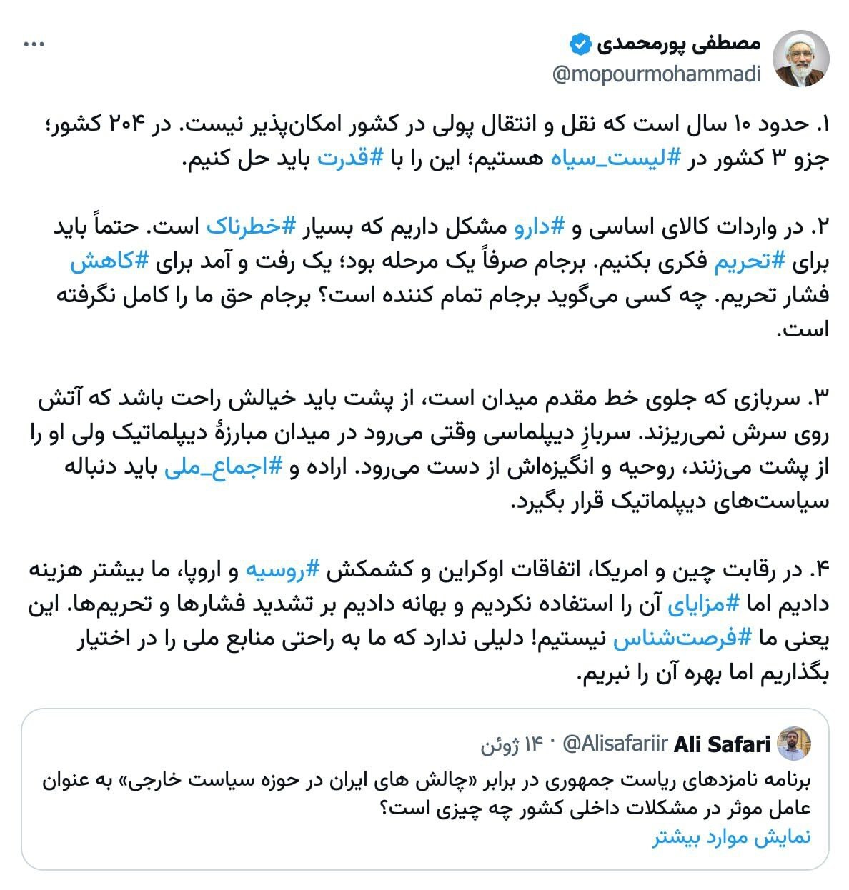 رویداد ۲۴ | مصطفی پورمحمدی در پاسخ به سوال یکی از خبرنگاران حوزه سیاست خارجی که در توییتر نوشته بود «برنامه نامزدهای ریاست جمهوری در برابر «چالشهای ایران در حوزه سیاست خارجی» به عنوان عامل موثر در مشکلات داخلی کشور چه چیزی است؟» نوشت: باید از لیست سیاه تبادلات مالی خارج شویم.