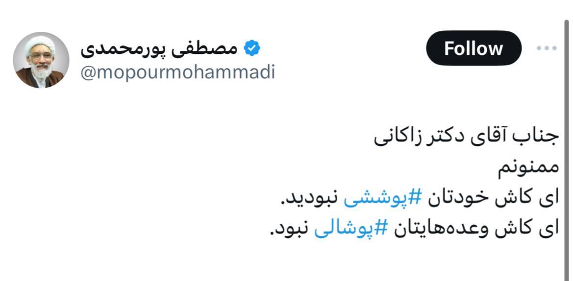 پورمحمدی خطاب به زاکانی نوشت:ای کاش خودتان پوششی نبود.ای کاش وعدههایتان پوشالی نبود.