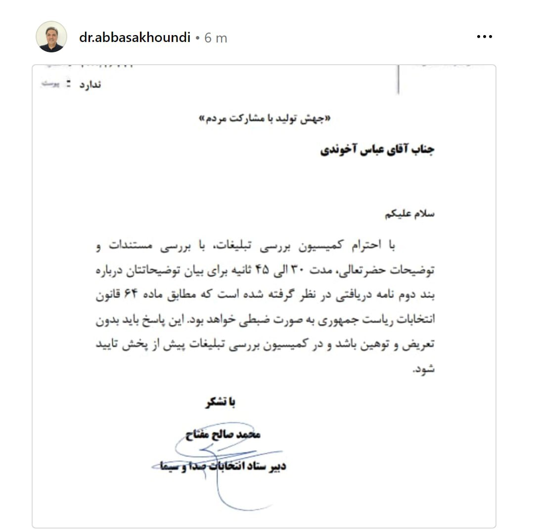 کمیسیون بررسی تبلیغات انتخابات «۴۵ ثانیه» به عباس آخوندی فرصت پاسخ داد