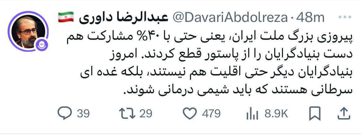 او نوشته: پیروزی بزرگ ملت ایران، یعنی حتی با ۴٠% مشارکت هم دست بنیادگرایان را از پاستور قطع کردند. امروز بنیادگرایان دیگر حتی اقلیت هم نیستند، بلکه غده ای سرطانی هستند که باید شیمی درمانی شوند.
