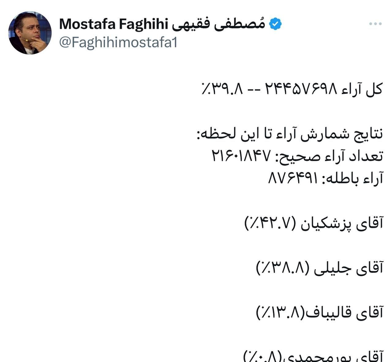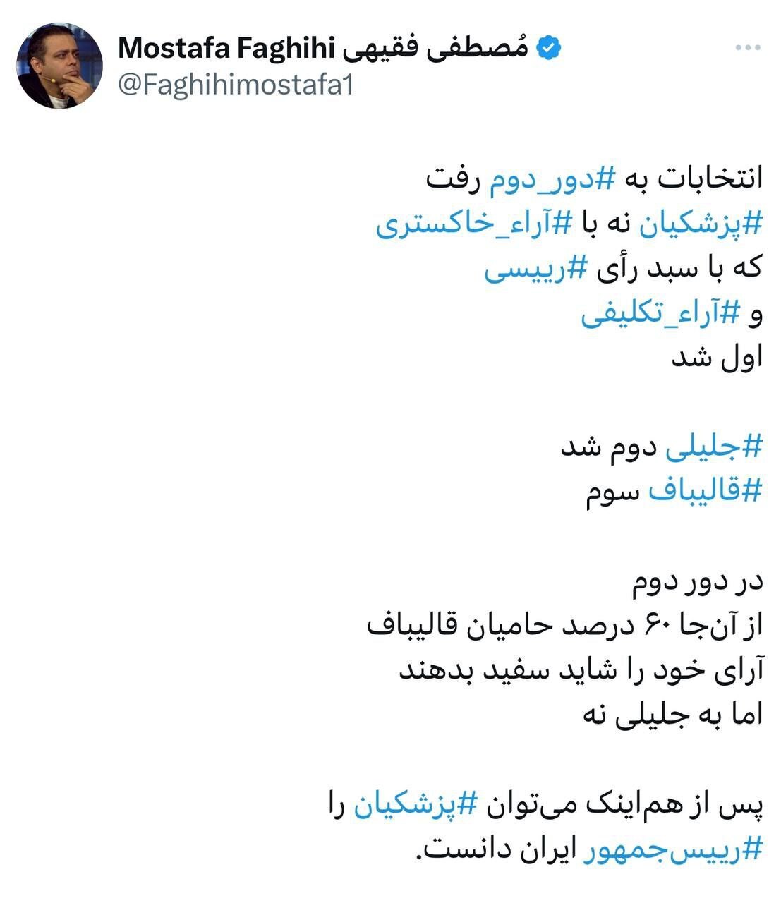 مصطفی فقیهی، فعال رسانهای نوشت: پزشکیان به دور دوم رفت؛ ۱۶ تیر، او رییسجمهور قطعی و شگفتیساز لیران است