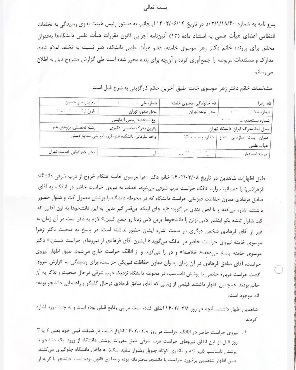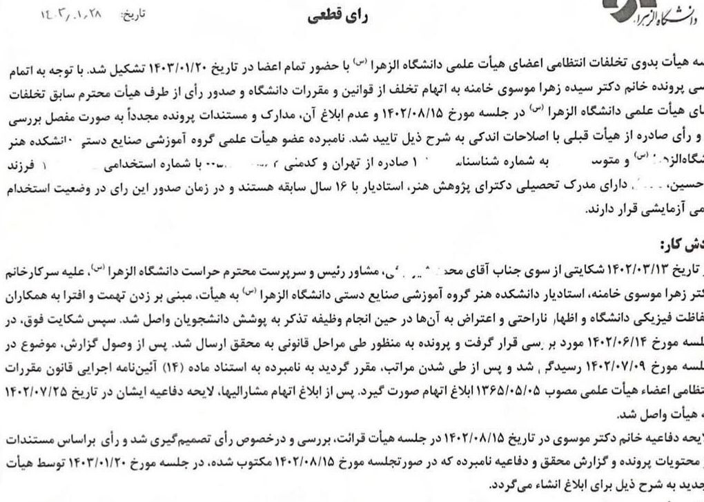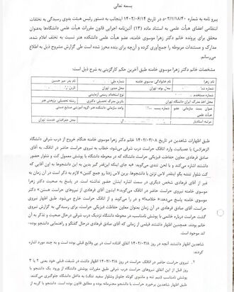 سند بررسی هیئت بدوی تخلفات و اخراج زهرا موسوی از دانشگاه الزهرا منتشر شد