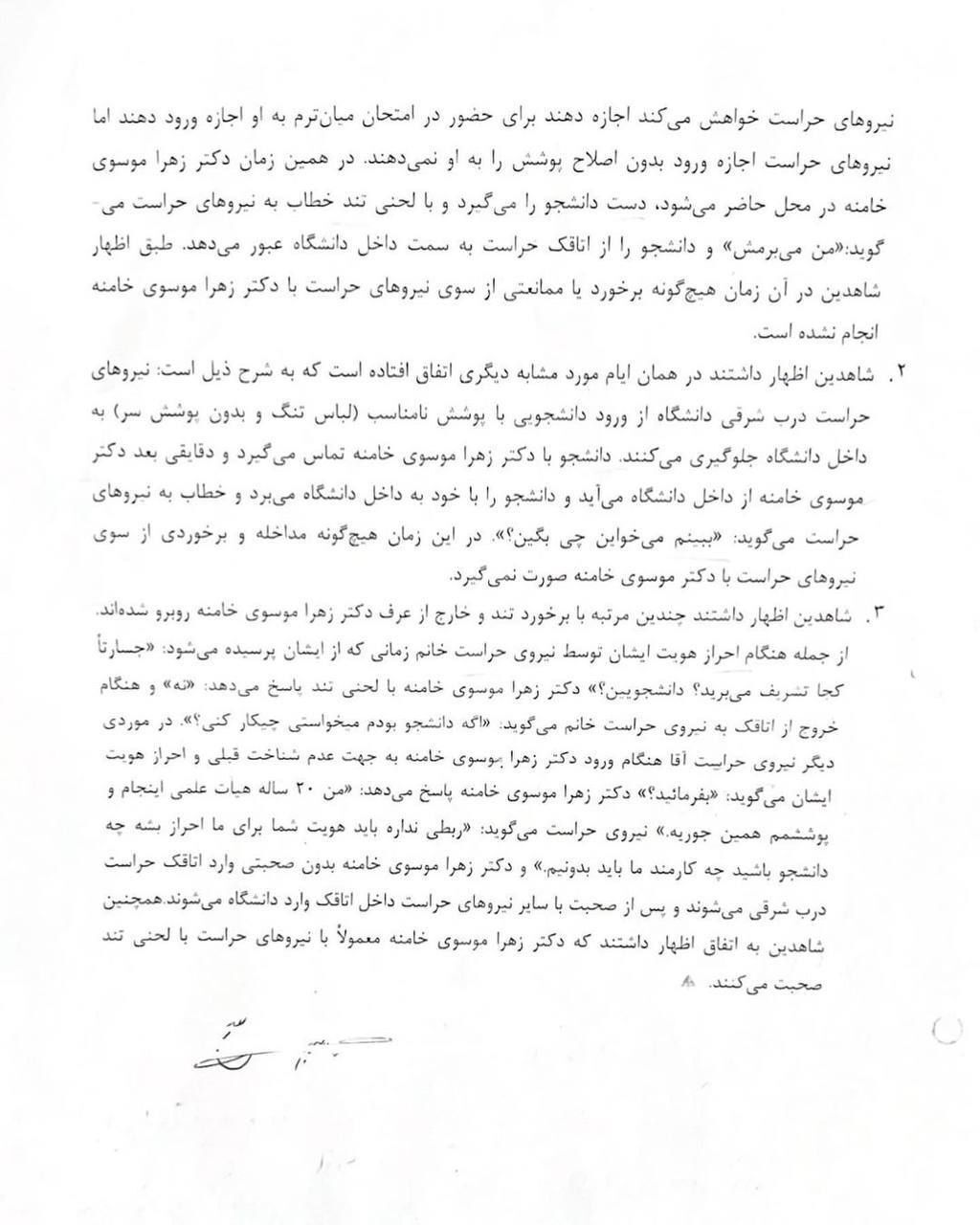 در بخشی از این سند آمده است: «پوشش یک دانشجو نامناسب بوده، اما از ورود او ممانعت میشود. دانشجو با دکتر موسوی تماس میگیرد. سپس دکتر موسوی دست او را میگیرد و به داخل میبرد و با لحنی تند میگوید: من میبرمش».