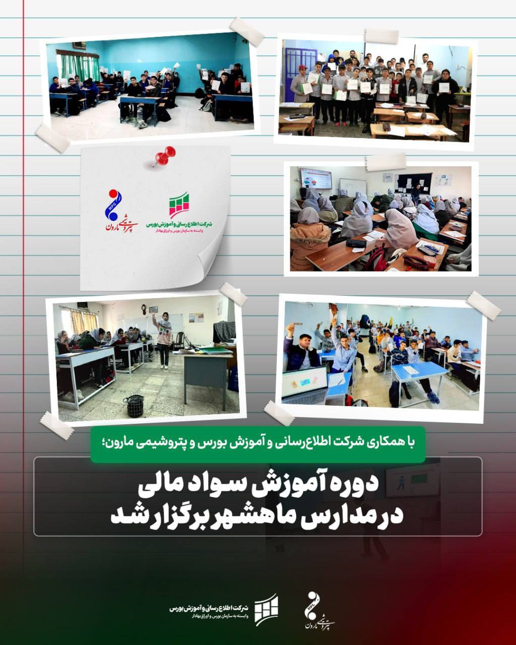در گام اول و برای نخستین بار شرکت اطلاع‌رسانی و آموزش بورس با همراهی پتروشیمی مارون و آموزش و پرورش شهرستان ماهشهر، دوره‌های سواد مالی را در ۱۵ مدرسه این شهرستان با هدف توانمندسازی دانش‌آموزان برگزار کرد.
