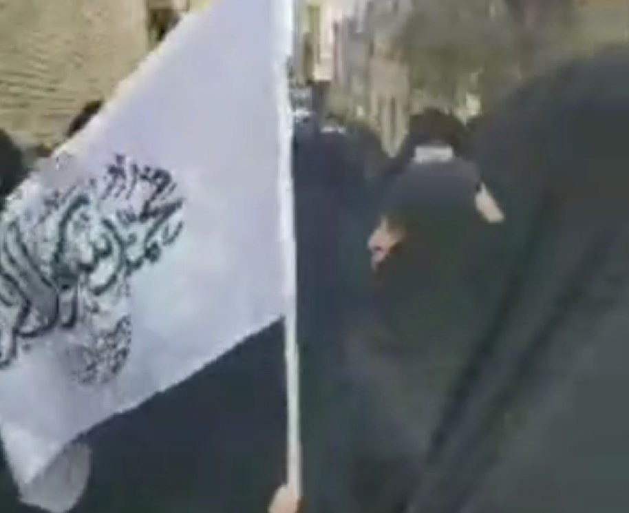 در تجمع امروز حامیان قانون حجاب در قم پرچمی شبیه به پرچم طالبان دیده میشود!